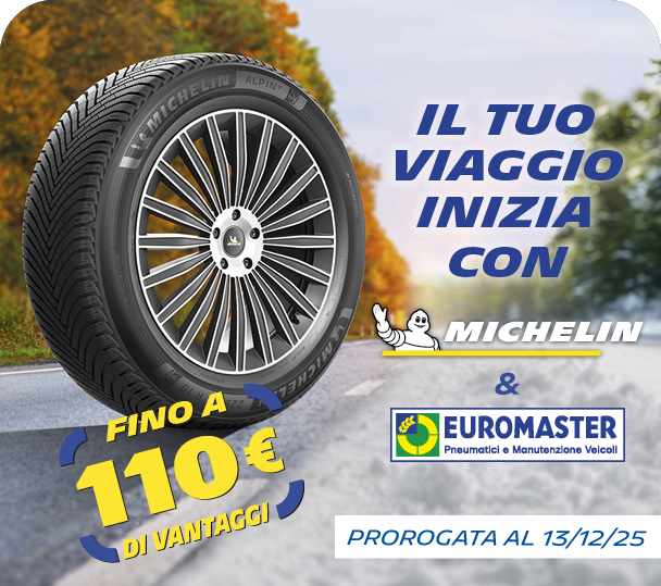 Dal 13 Ottobre al 13 Dicembre 2025, acquista presso un rivenditore Euromaster aderente almeno 4 pneumatici vettura, SUV o trasporto leggero delle gamme Estate, Inverno o All Season, con diametro da 17 pollici in su.
