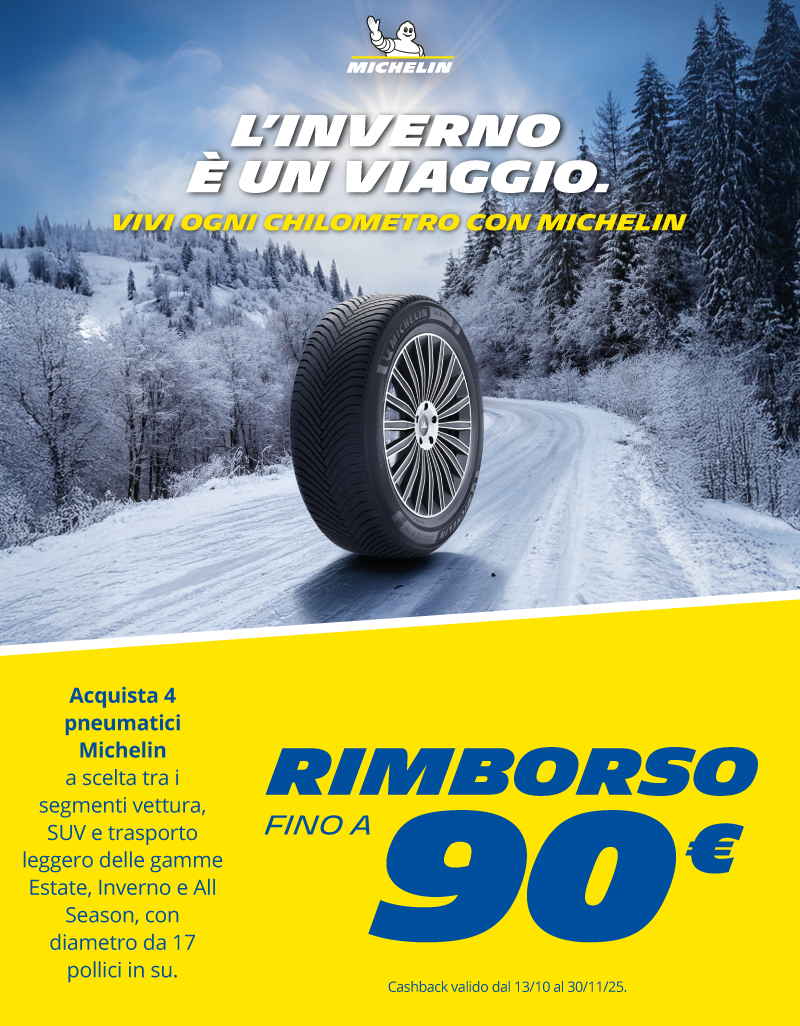 Dal 13 Ottobre 2025 al 30 Novembre 2025, recati in un rivenditore aderente ed acquista almeno un set di 4 pneumatici dei segmenti vettura,